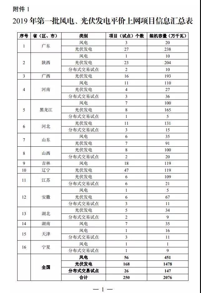 附件:1.2019年第一批風電(diàn)、光伏發電(diàn)平價上(shàng)網項目信息彙總表