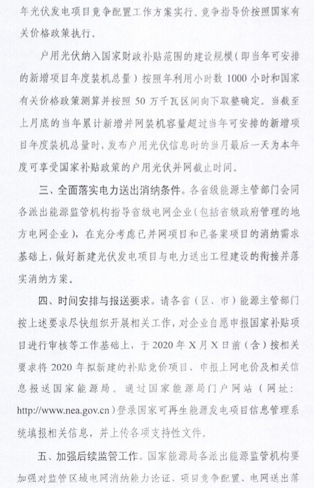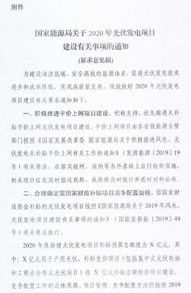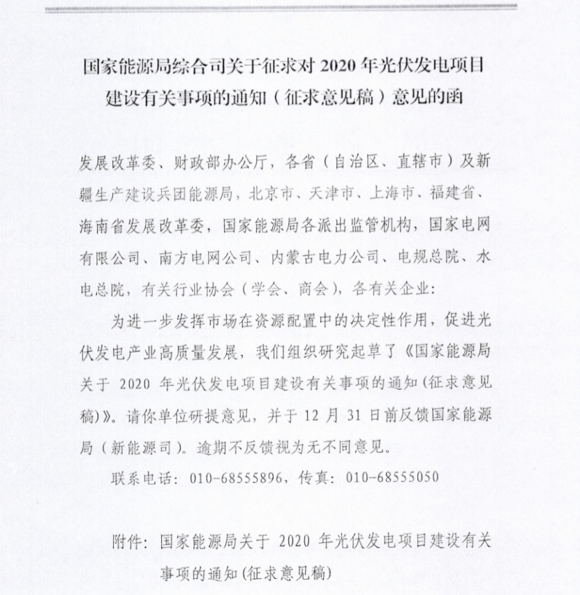 《關于征求對2020年光伏發電(diàn)項目建設有(yǒu)關事項的通(tōng)知(征求意見稿)意見的函》